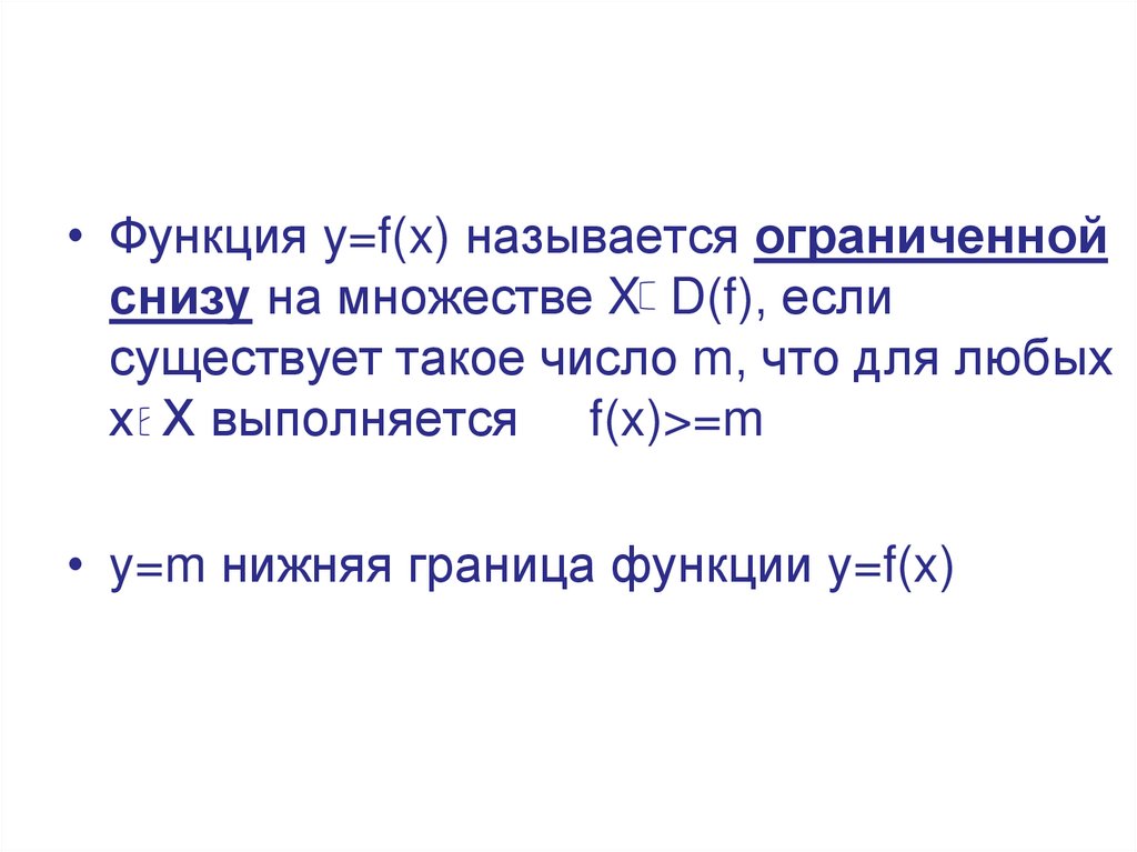 • Функция y=f(x) называется ограниченнойснизу на множестве X D(f), если