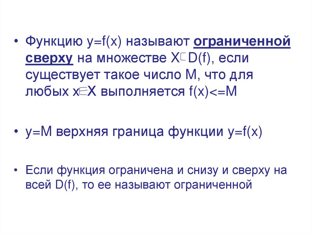 • Функцию y=f(x) называют ограниченнойсверху на множестве X D(f), если