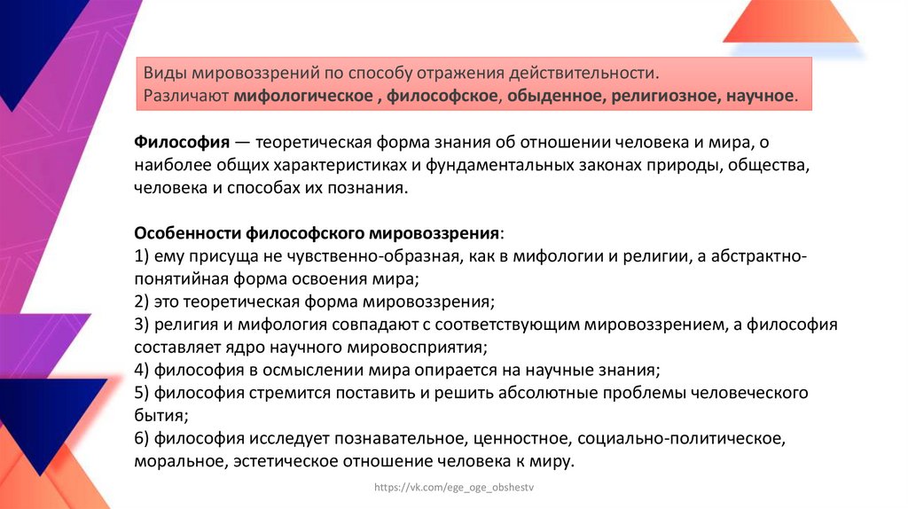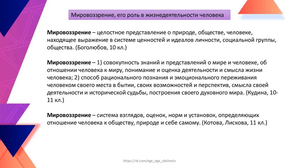 Мировоззрение – 1) совокупность знаний и представлений о мире и человеке, об