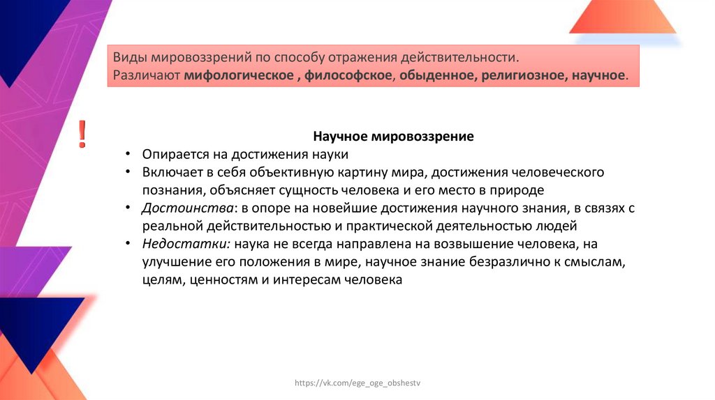 Виды мировоззрений по способу отражения действительности.Различают мифологическое , философское, обыденное, религиозное, научное.