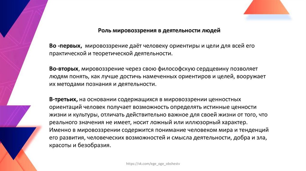Мировоззрение, его роль в жизнедеятельности человекаМировоззрение – целостное представление о природе, обществе, человеке,