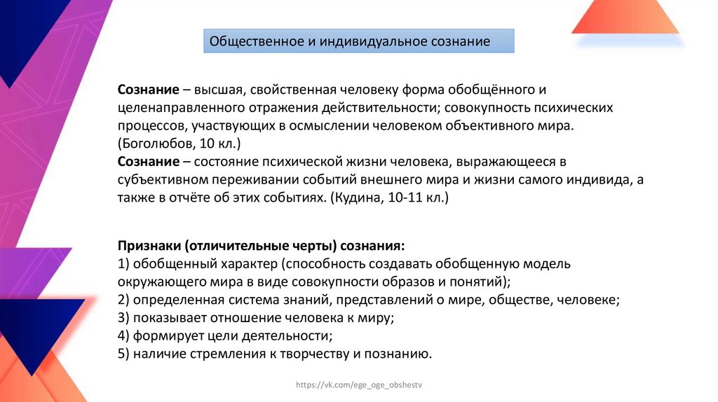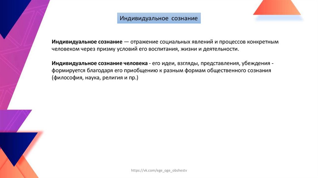 Индивидуальное сознаниеИндивидуальное сознание — отражение социальных явлений и процессов конкретным