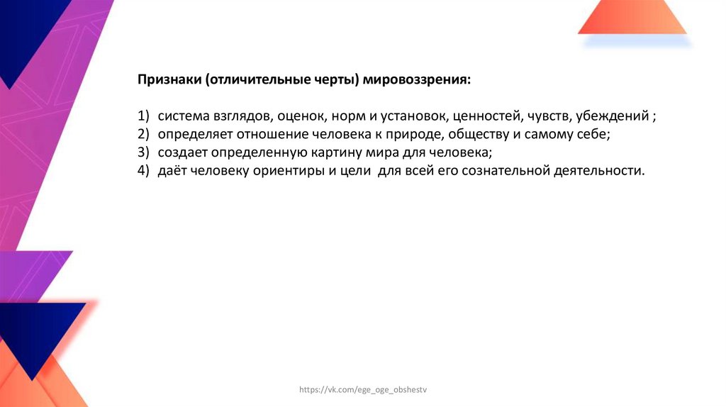 Признаки (отличительные черты) мировоззрения:1) система взглядов, оценок, норм и установок, ценностей, чувств, убеждений ;