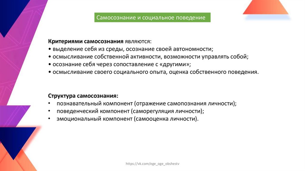 Самосознание и социальное поведениеКритериями самосознания являются: