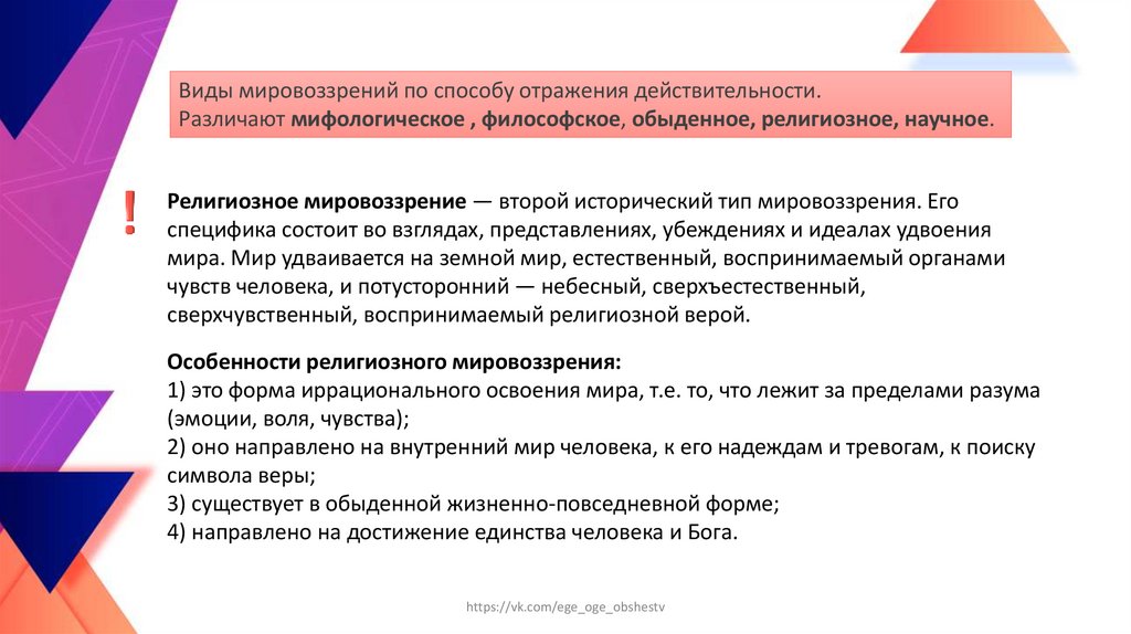 Особенности религиозного мировоззрения: