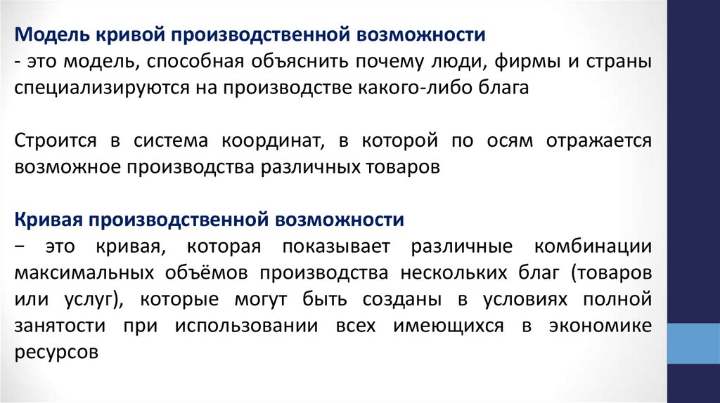 Модель кривой производственной возможности- это модель, способная объяснить почему люди, фирмы и страны