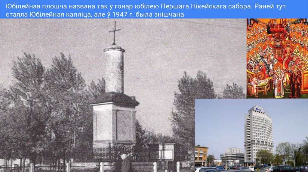 Юбілейная плошча названа так у гонар юбілею Першага Нікейскага сабора. Раней тутстаяла Юбілейная капліца, але ў 1947 г. была знішчана