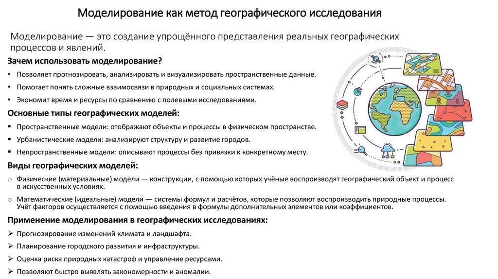 1. Моделирование как метод географического исследования Моделирование — это создание упрощённого представления реальных