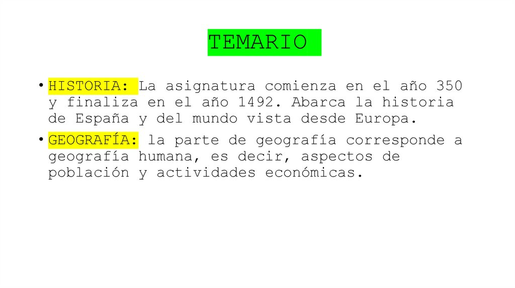 • HISTORIA: La asignatura comienza en el año 350y finaliza en el año 1492. Abarca la historia