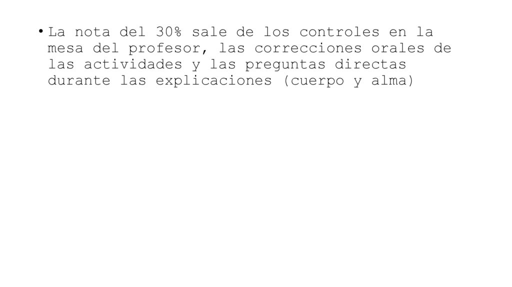 • La nota del 30% sale de los controles en lamesa del profesor, las correcciones orales de