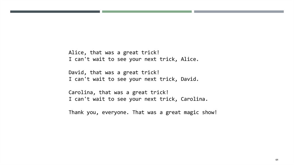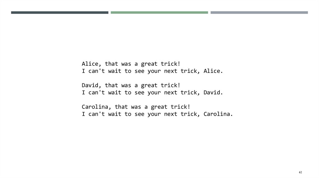 подчеркивания. Например, имя greeting_ message допустимо, а имя greeting message вызовет ошибку.