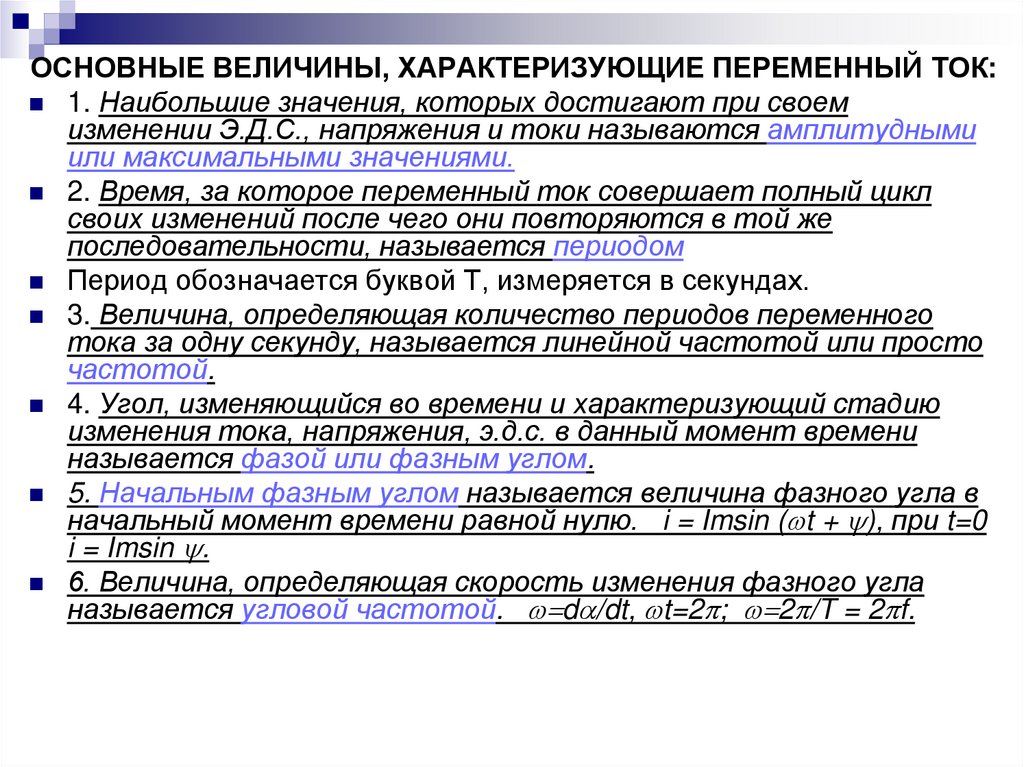 ОСНОВНЫЕ ВЕЛИЧИНЫ, ХАРАКТЕРИЗУЮЩИЕ ПЕРЕМЕННЫЙ ТОК:1. Наибольшие значения, которых достигают при своем
