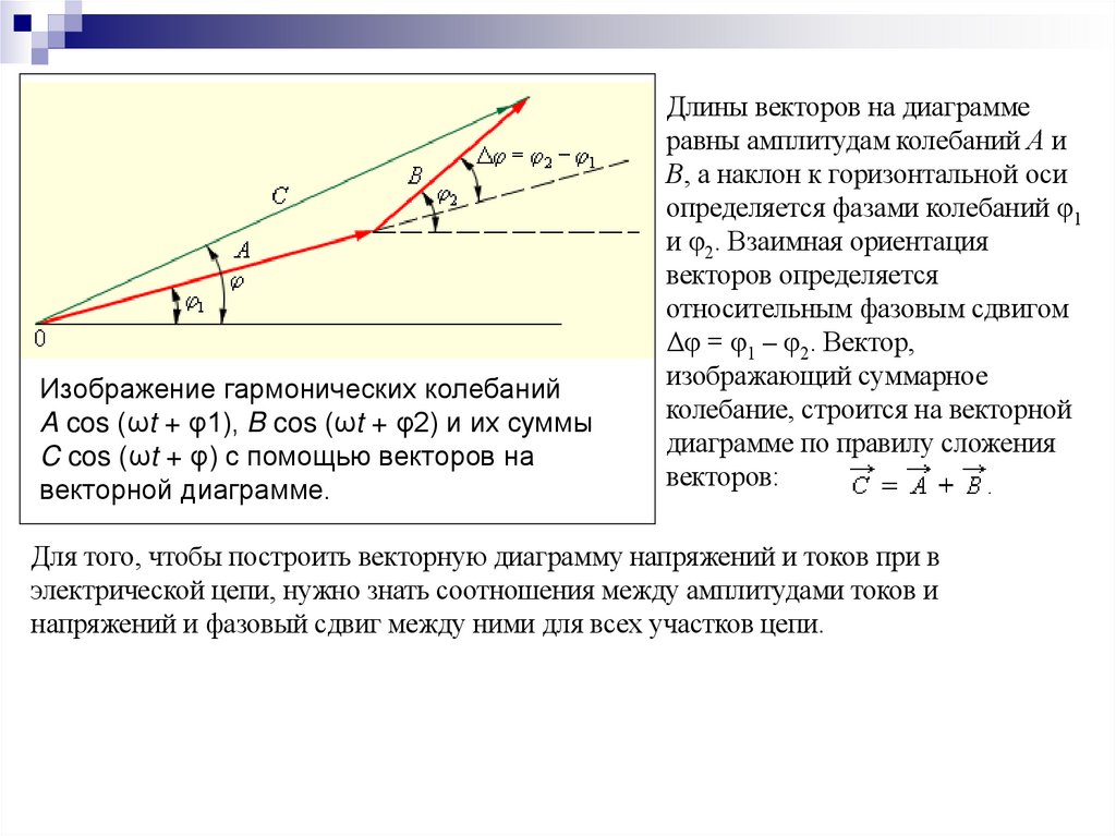 Изображение гармонических колебанийA cos (ωt + φ1), B cos (ωt + φ2) и их суммы