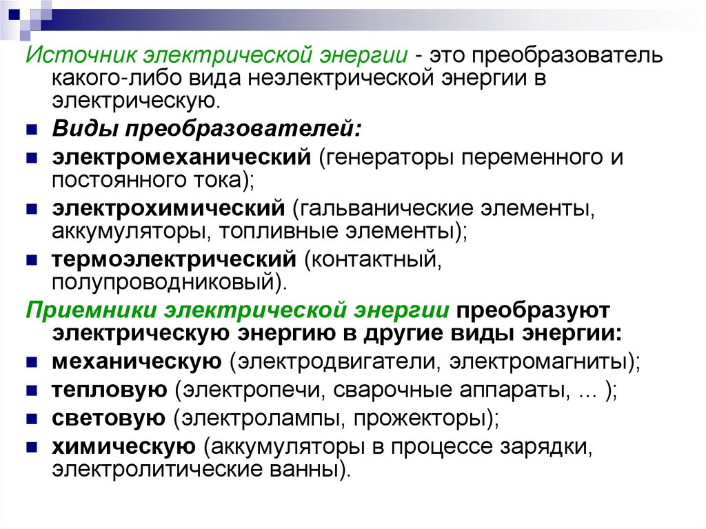 Источник электрической энергии - это преобразователькакого-либо вида неэлектрической энергии в