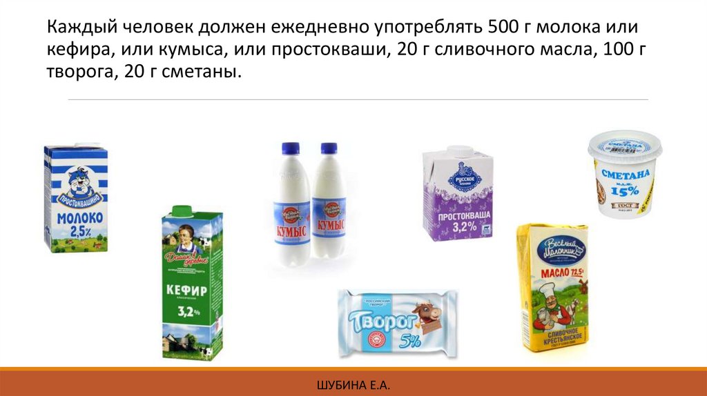 Каждый человек должен ежедневно употреблять 500 г молока иликефира, или кумыса, или простокваши, 20 г сливочного масла, 100 г