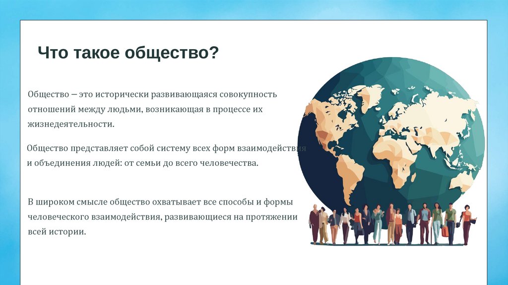 Что такое общество?Общество — это исторически развивающаяся совокупность