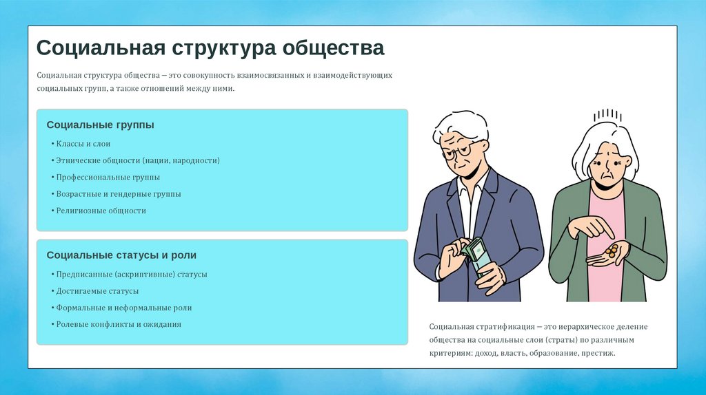 Социальная структура обществаСоциальная структура общества — это совокупность взаимосвязанных и взаимодействующих