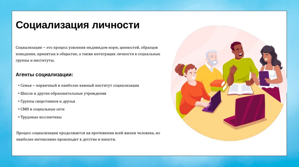 Социализация личностиСоциализация — это процесс усвоения индивидом норм, ценностей, образцов