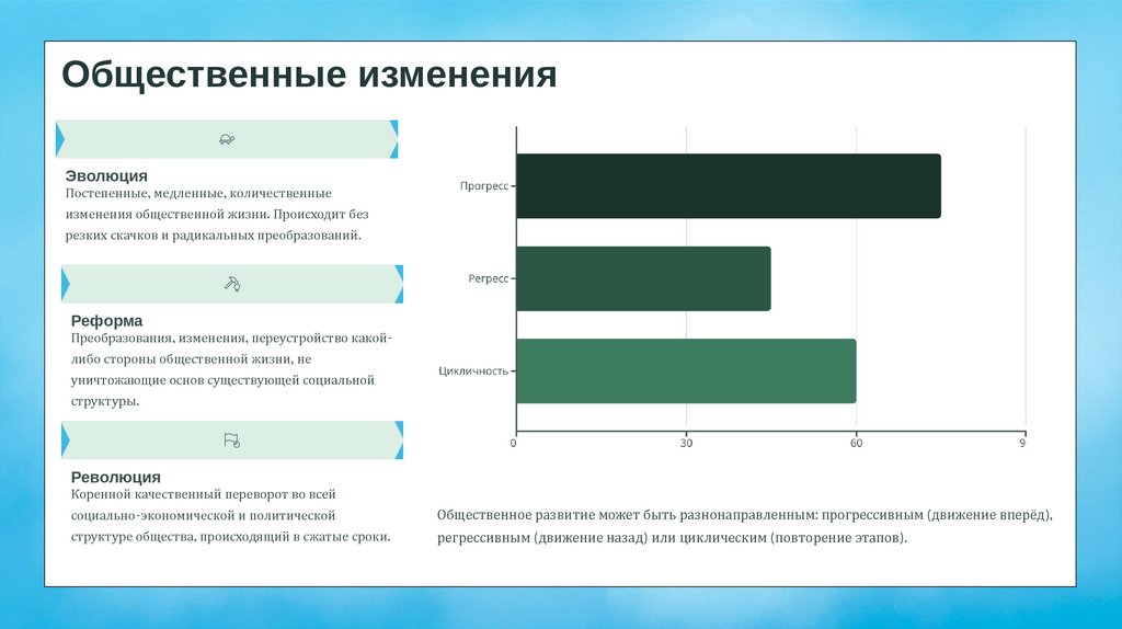 Общественное развитие может быть разнонаправленным: прогрессивным (движение вперёд),