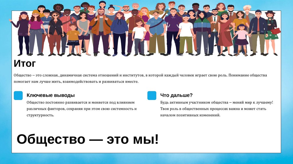 ИтогОбщество — это сложная, динамичная система отношений и институтов, в которой каждый человек играет свою роль. Понимание общества