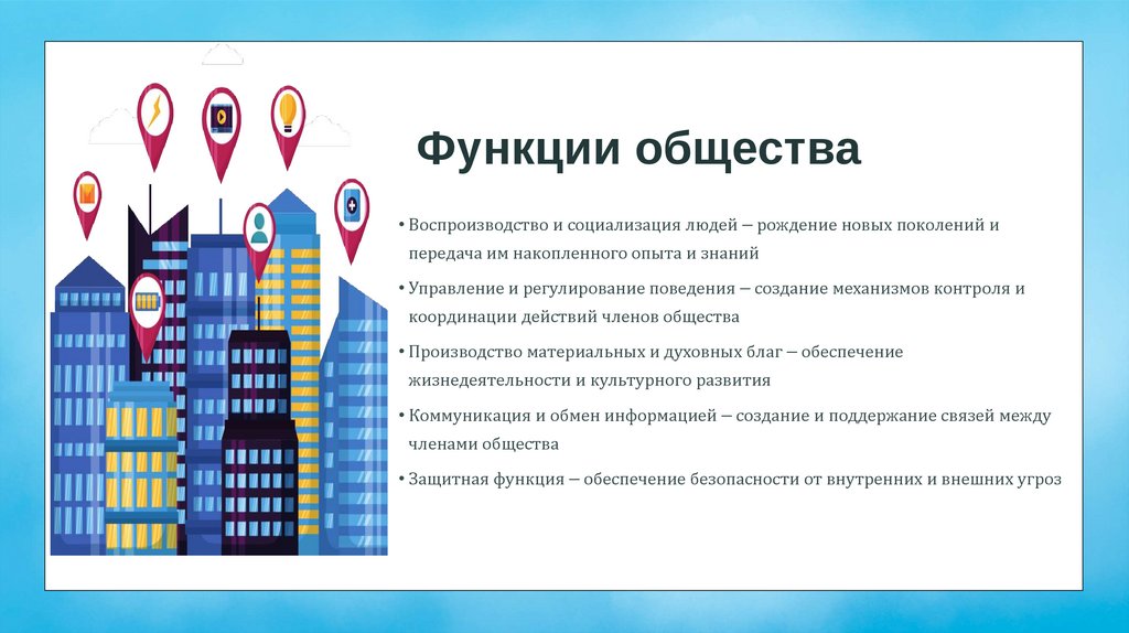 Функции общества• Воспроизводство и социализация людей — рождение новых поколений и