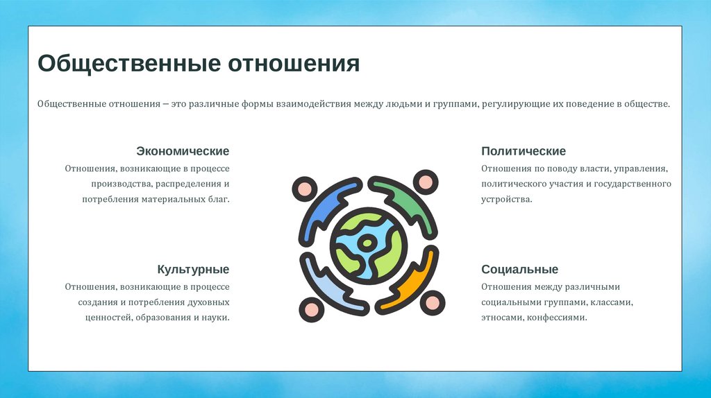 Общественные отношенияОбщественные отношения — это различные формы взаимодействия между людьми и группами, регулирующие их поведение в обществе.