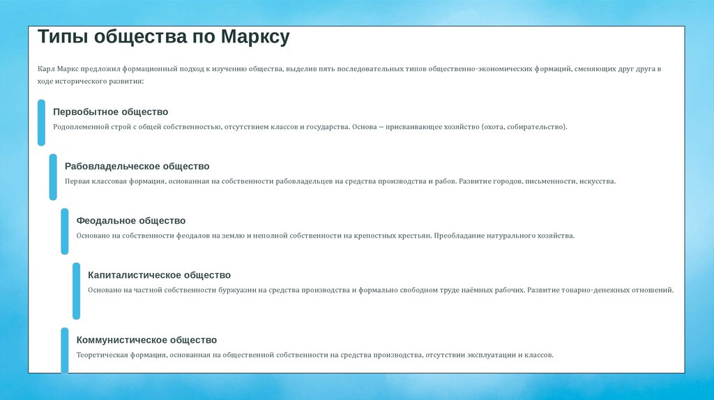 Типы общества по МарксуКарл Маркс предложил формационный подход к изучению общества, выделив пять последовательных типов общественно-экономических формаций, сменяющих друг друга в