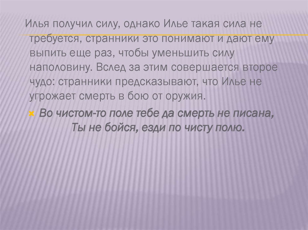 Илья получил силу, однако Илье такая сила нетребуется, странники это понимают и дают ему