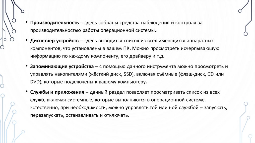 • Устранение неполадок – диагностика и устранение различных неполадок операционной