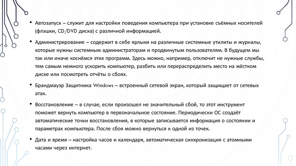 • Автозапуск – служит для настройки поведения компьютера при установке съёмных носителей(флэшки, CD/DVD диска) с различной информацией.