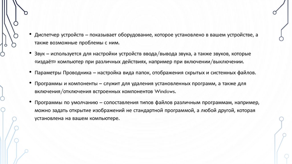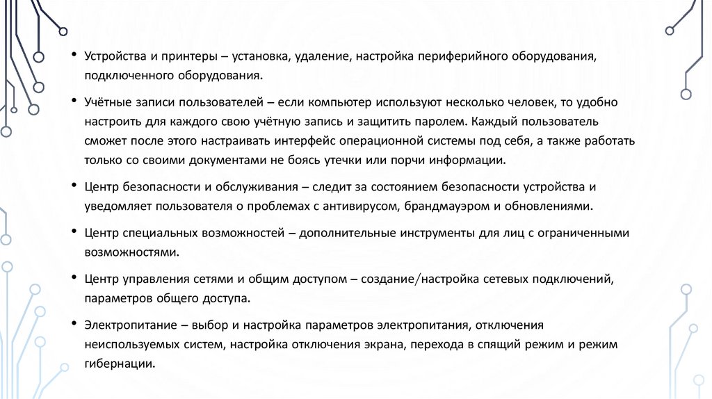 • Устройства и принтеры – установка, удаление, настройка периферийного оборудования,подключенного оборудования.