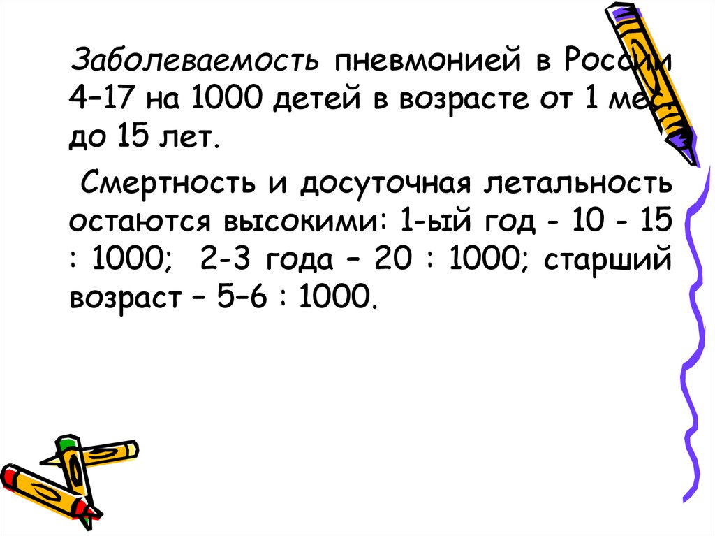 Заболеваемость пневмонией в России4–17 на 1000 детей в возрасте от 1 мес.