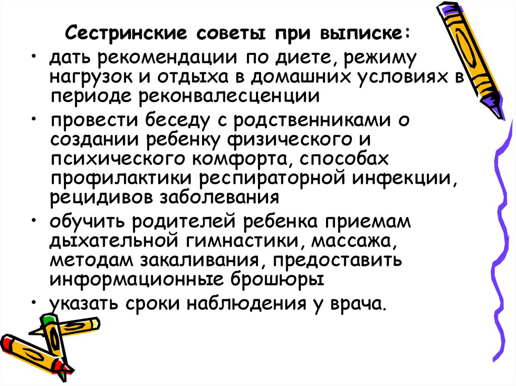 Сестринские советы при выписке:• дать рекомендации по диете, режиму