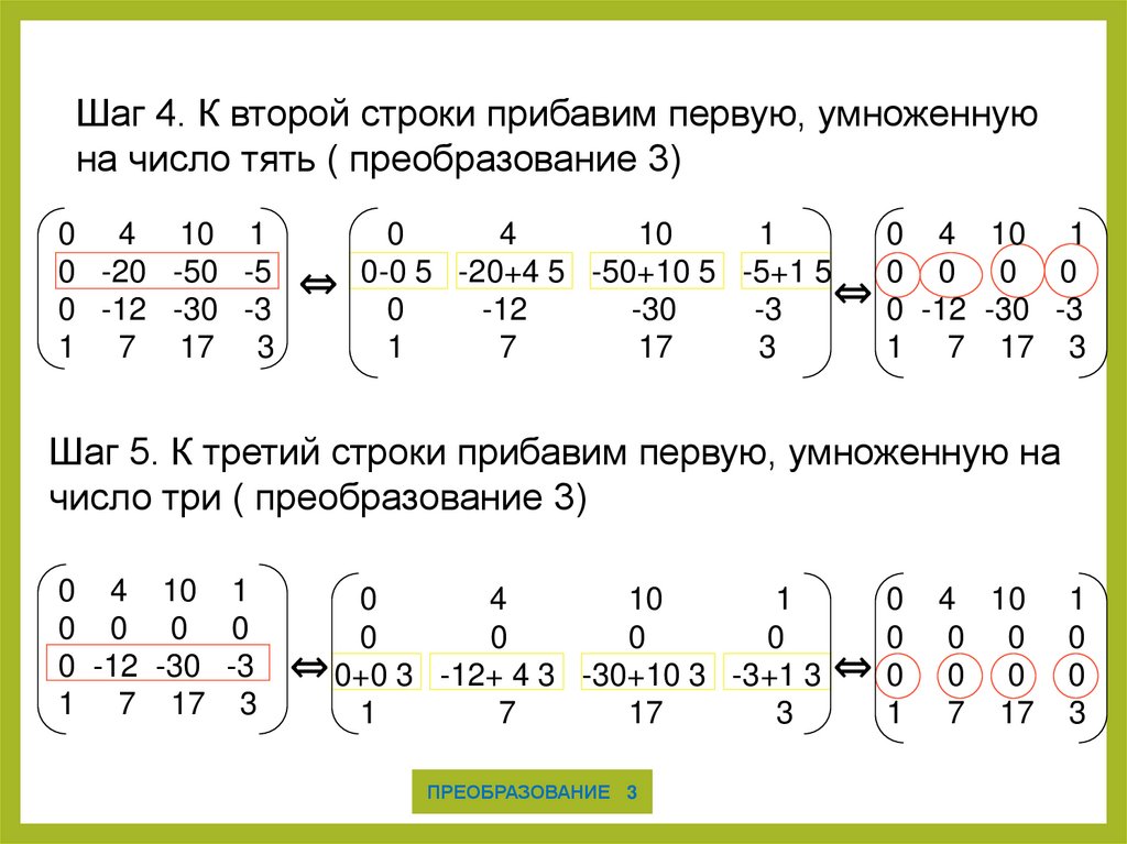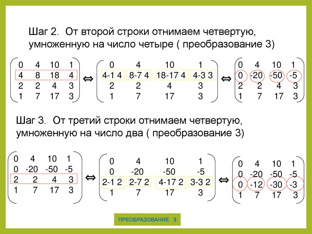 Шаг 2. От второй строки отнимаем четвертую,умноженную на число четыре ( преобразование 3)