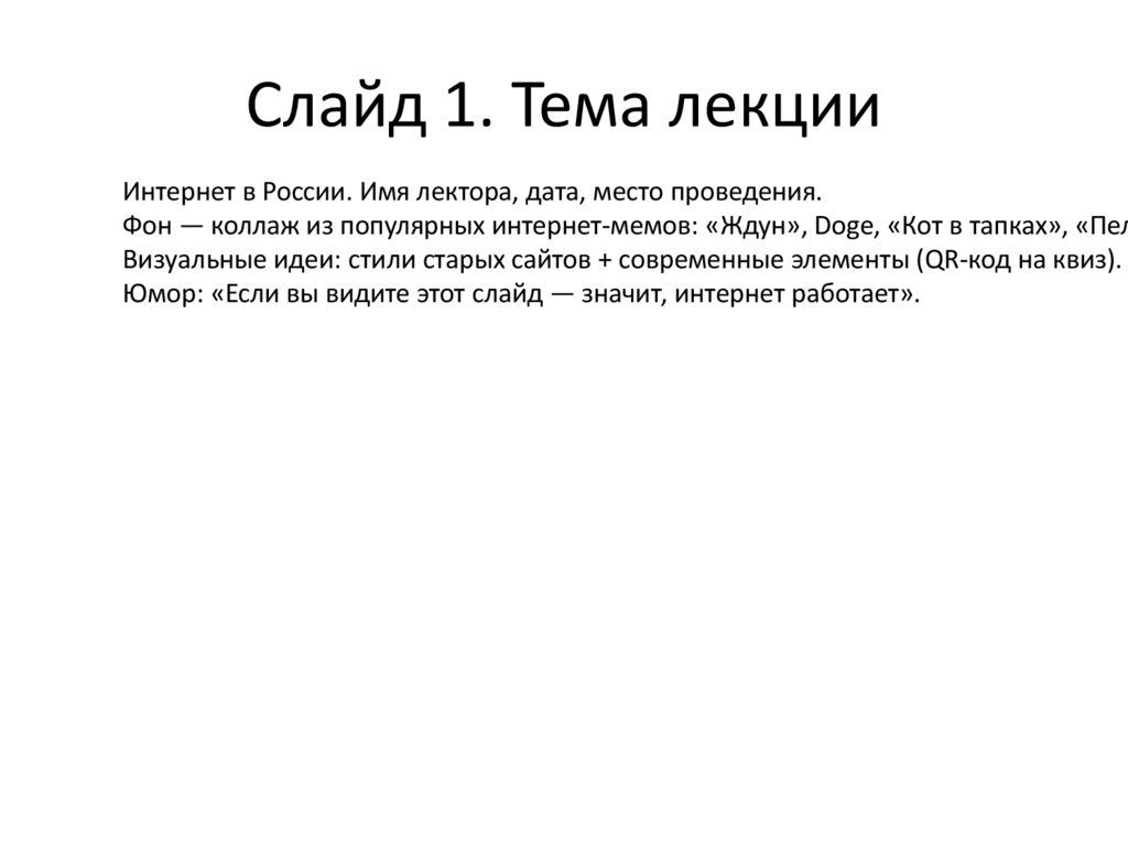Слайд 1. Тема лекцииИнтернет в России. Имя лектора, дата, место проведения.