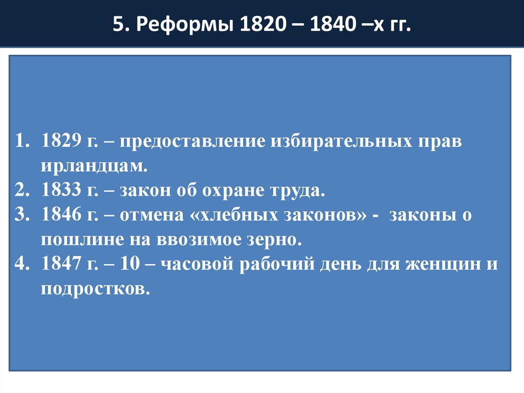 5. Реформы 1820 – 1840 –х гг.1. 1829 г. – предоставление избирательных прав