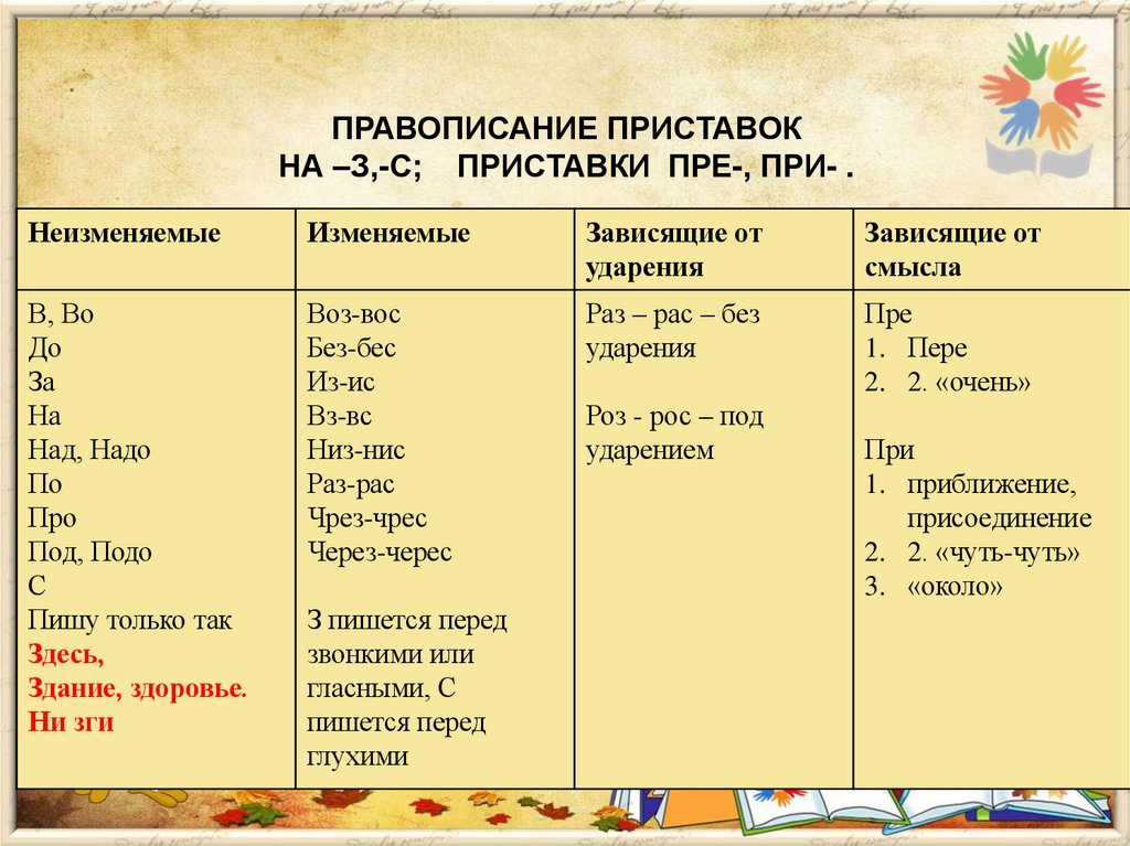 Правописание приставок на –з,-с; приставки пре-, при-