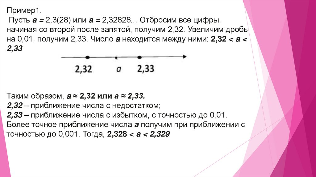 Пример1.Пусть a = 2,3(28) или a = 2,32828... Отбросим все цифры,