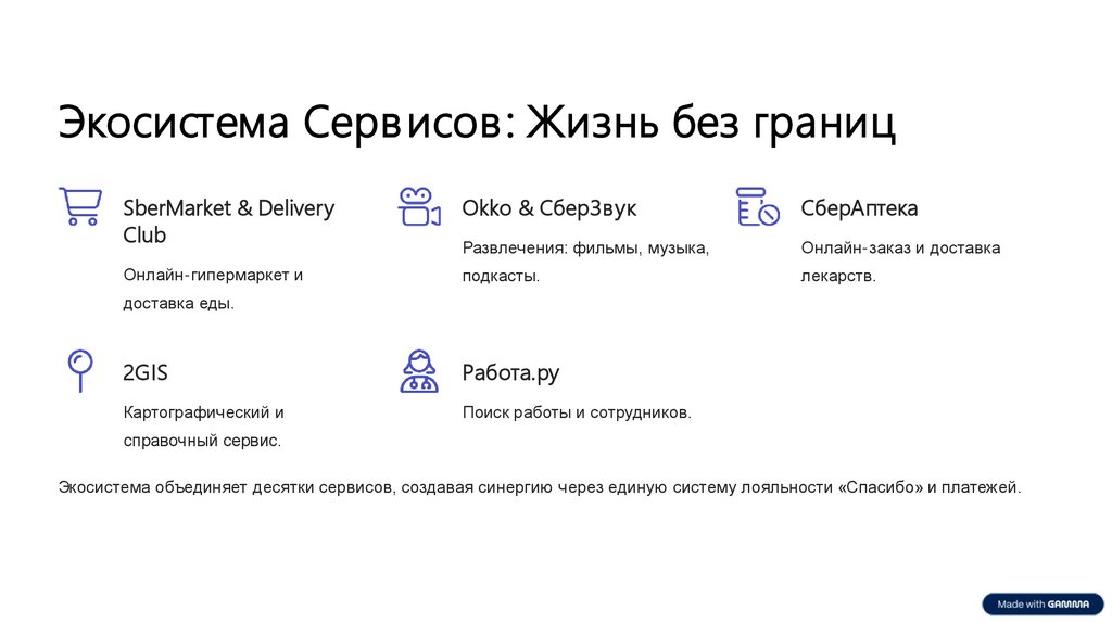 Экосистема объединяет десятки сервисов, создавая синергию через единую систему лояльности «Спасибо» и платежей.