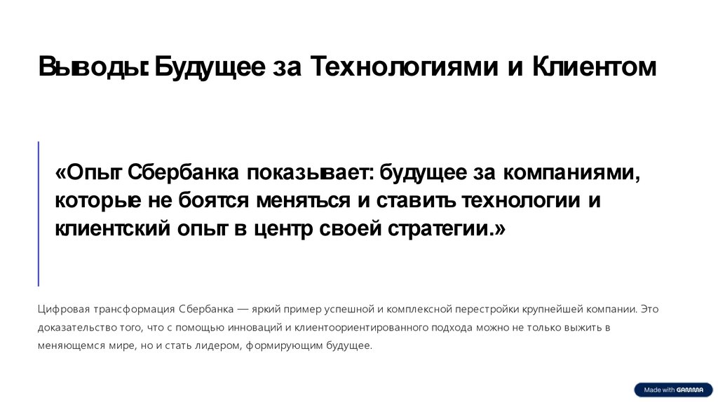 Выводы: Будущее за Технологиями и Клиентом«Опыт Сбербанка показывает: будущее за компаниями,