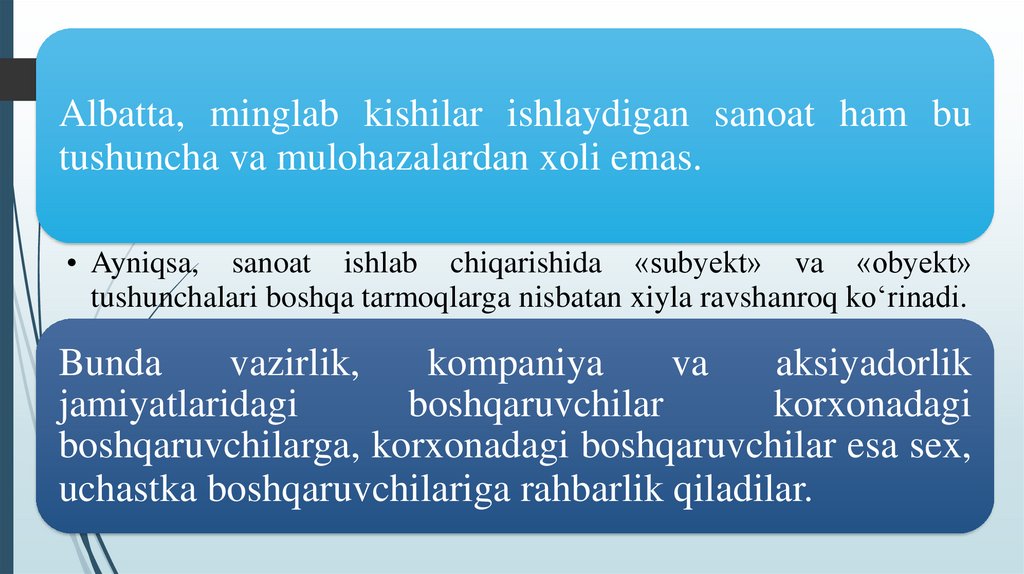 • Ayniqsa, sanoat ishlab chiqarishida «subyekt» va «obyekt»