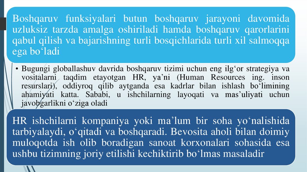 Boshqaruv funksiyalari butun boshqaruv jarayoni davomidauzluksiz tarzda amalga oshiriladi hamda boshqaruv qarorlarini