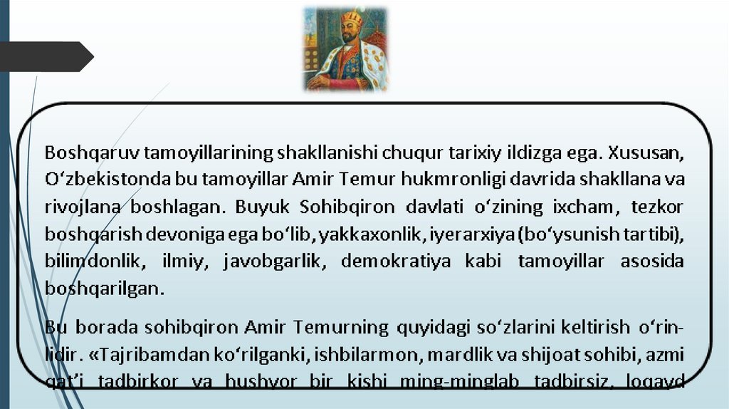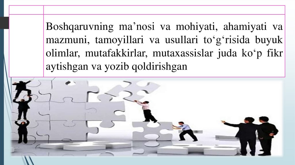 Boshqaruvning ma’nosi va mohiyati, ahamiyati vamazmuni, tamoyillari va usullari to‘g‘risida buyuk