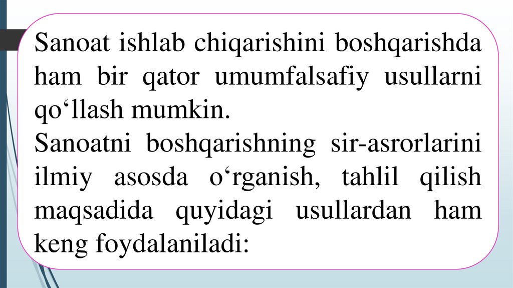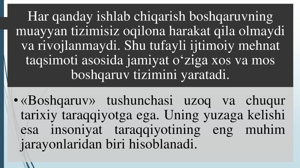 Har qanday ishlab chiqarish boshqaruvningmuayyan tizimisiz oqilona harakat qila olmaydi