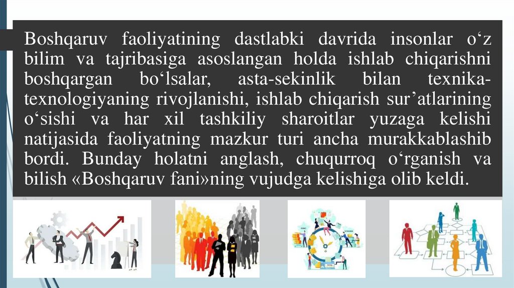 Boshqaruv faoliyatining dastlabki davrida insonlar o‘zbilim va tajribasiga asoslangan holda ishlab chiqarishni