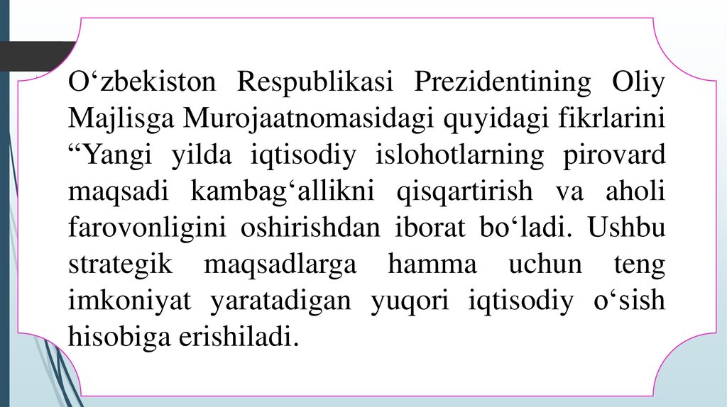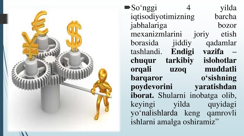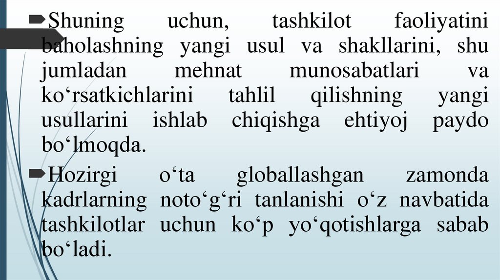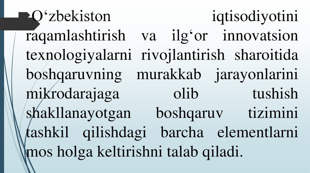 • Bugungi globallashuv davrida boshqaruv tizimi uchun eng ilg‘or strategiya va