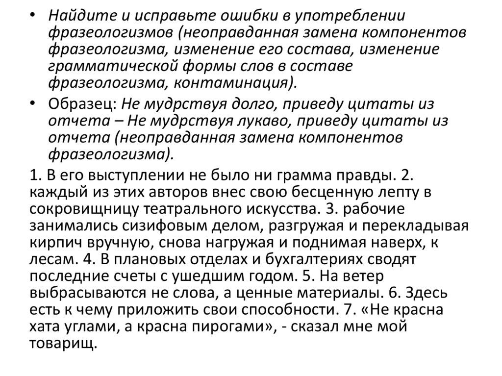 • Найдите и исправьте ошибки в употреблениифразеологизмов (неоправданная замена компонентов