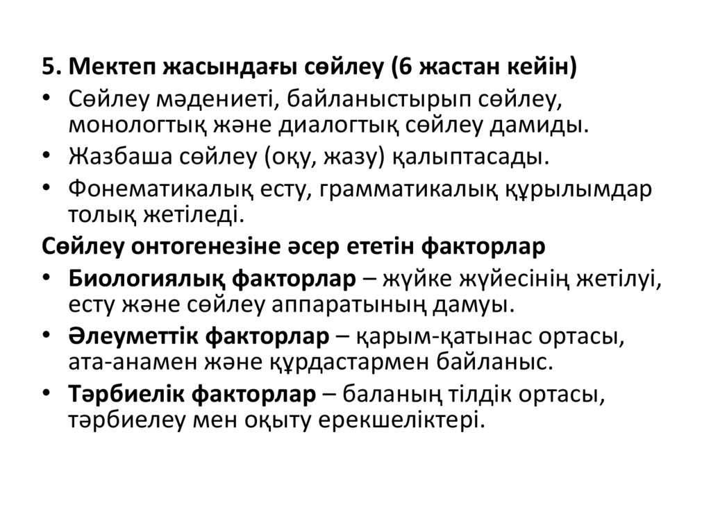 5. Мектеп жасындағы сөйлеу (6 жастан кейін)• Сөйлеу мәдениеті, байланыстырып сөйлеу,