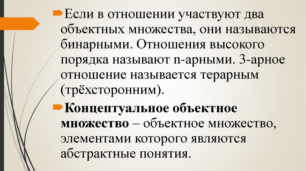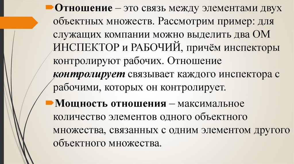 Отношение – это связь между элементами двухобъектных множеств. Рассмотрим пример: для
