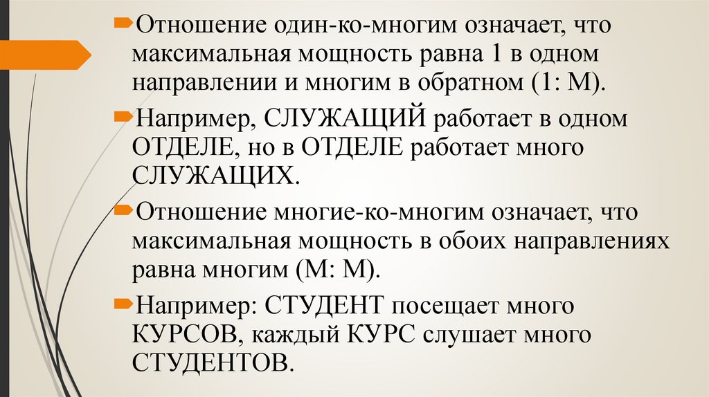 Отношение один-ко-многим означает, чтомаксимальная мощность равна 1 в одном